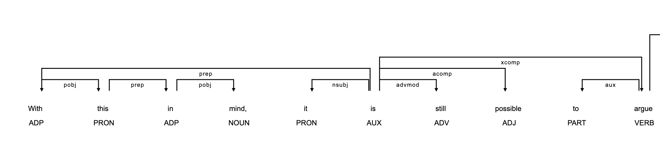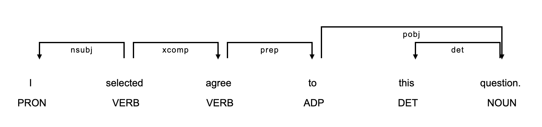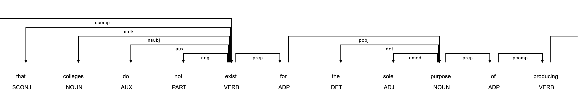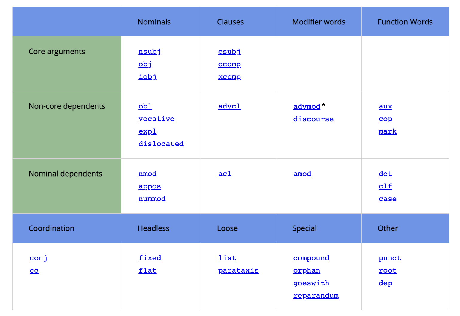 nsubj, nsubj_pass, agent, ncomp, dobj, iobj, pobj.| Structure | Abbreviation | Example of Structure |