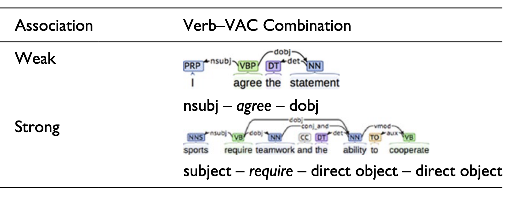 | Main verb lemma | Verb Argument Construction | Example | Freq (PMW) in COCA |
