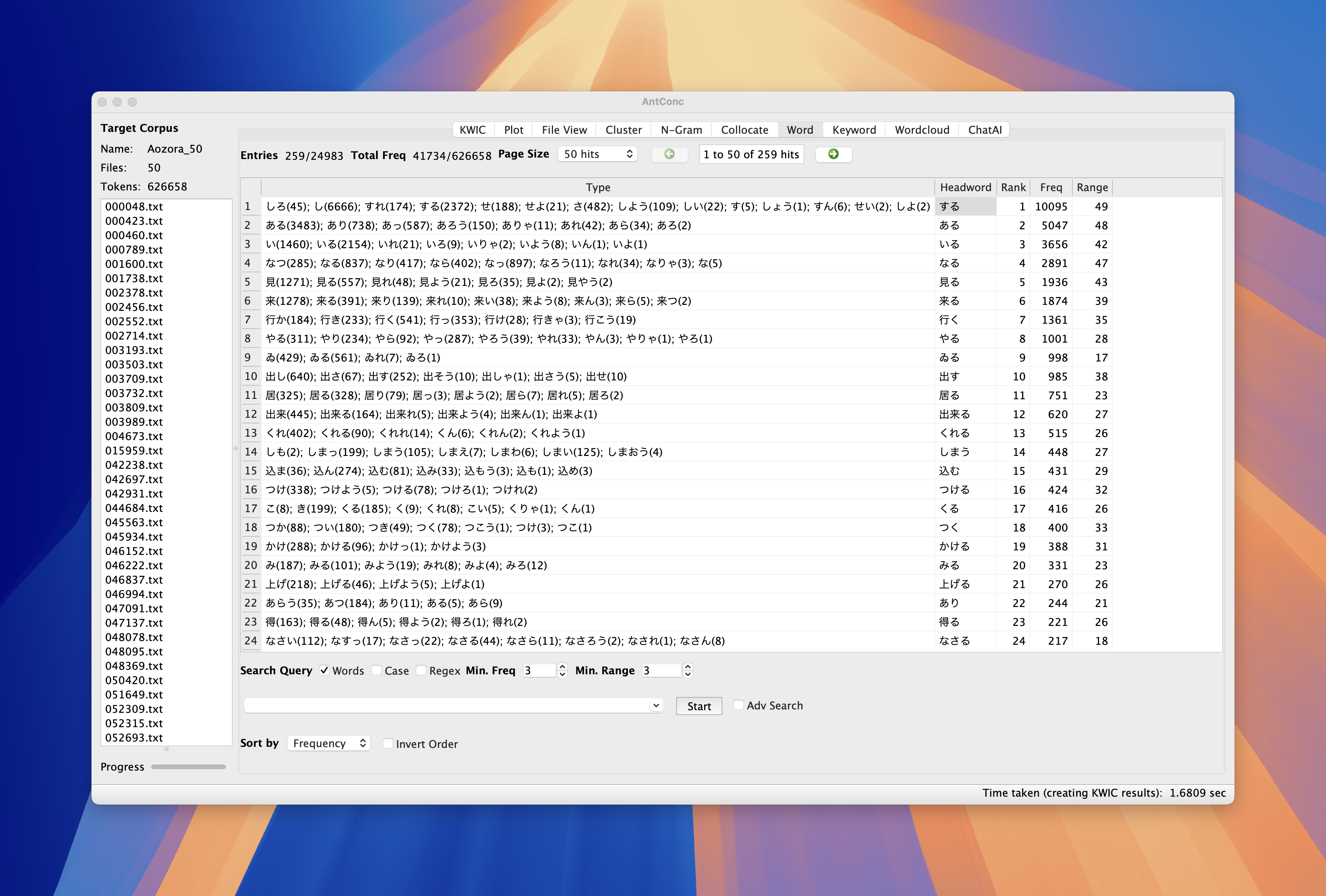 AntConc, create following frequency lists: