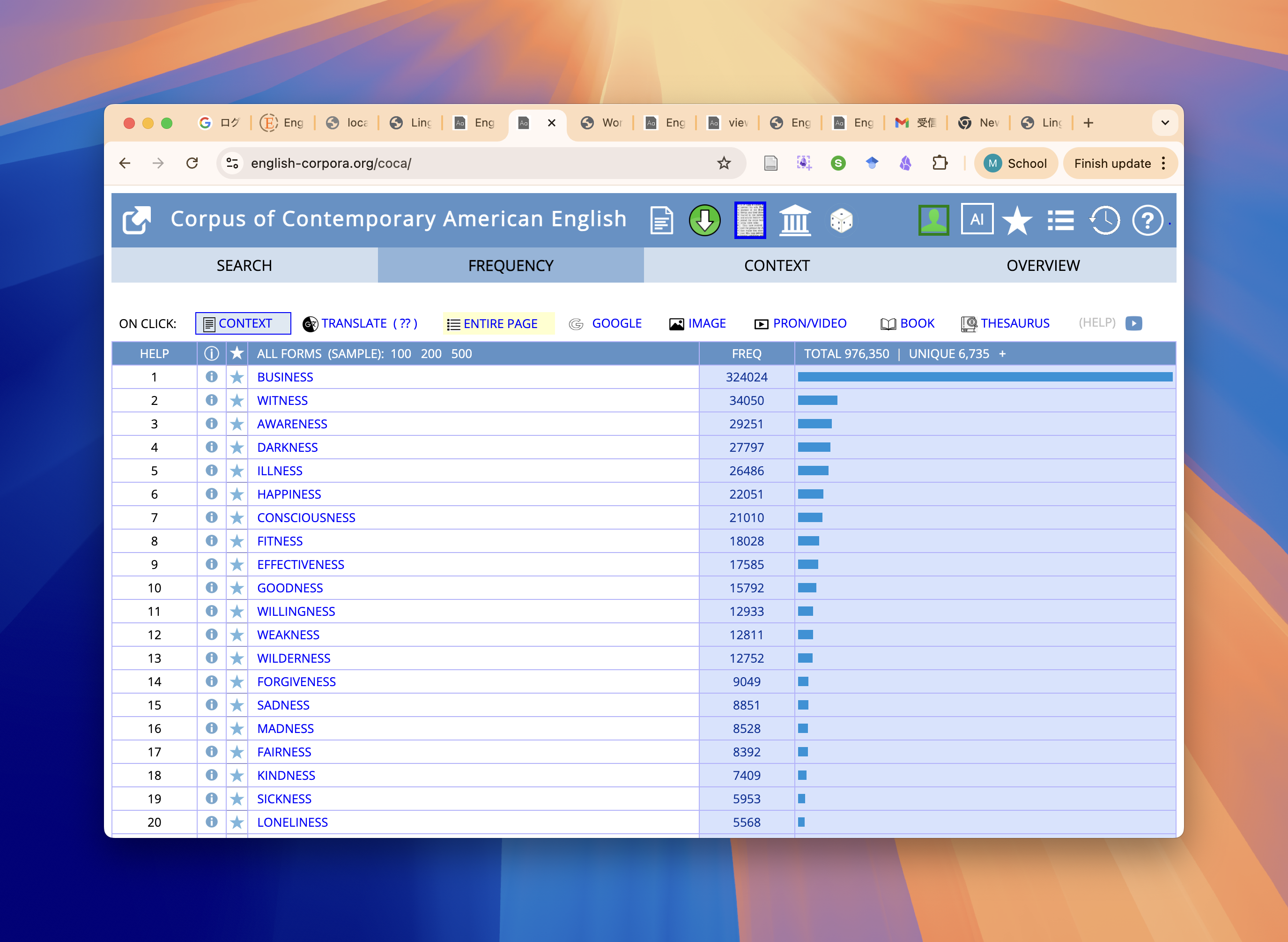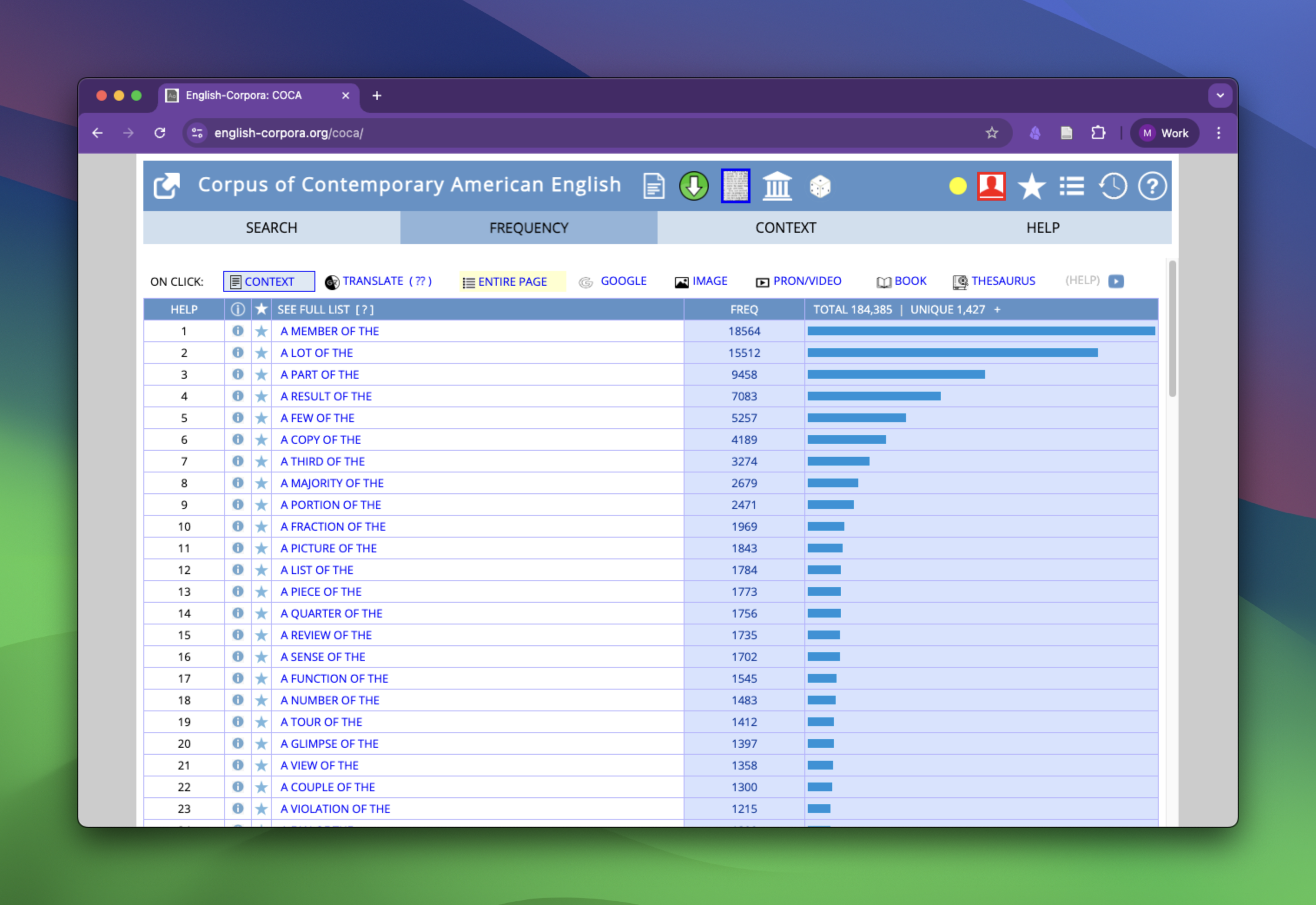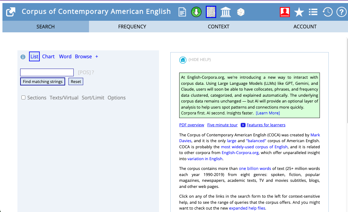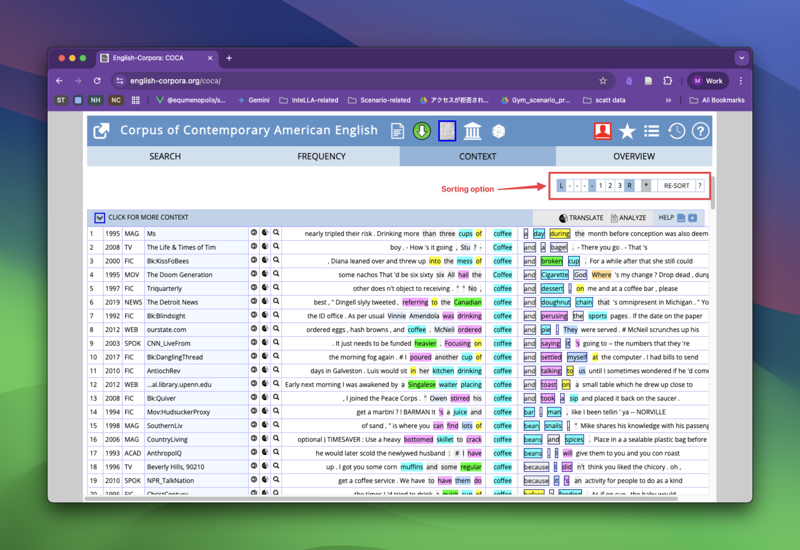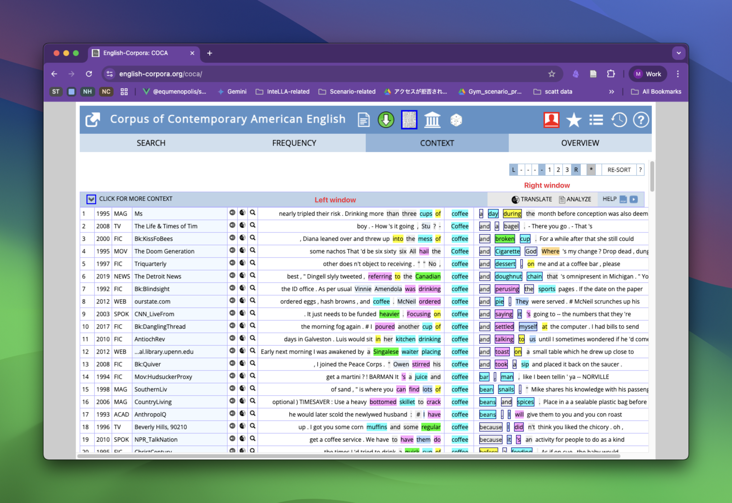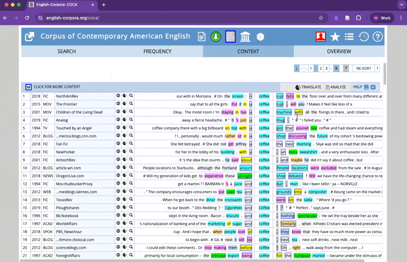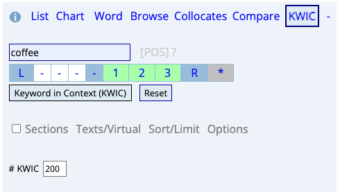 | KWIC | View words in context | Any search term | - Sort by L1, R1, etc. - Find patterns in usage |
