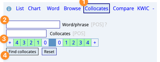| Collocates | Find co-occurring words | Words near target | - Specify window size - Statistical associations |