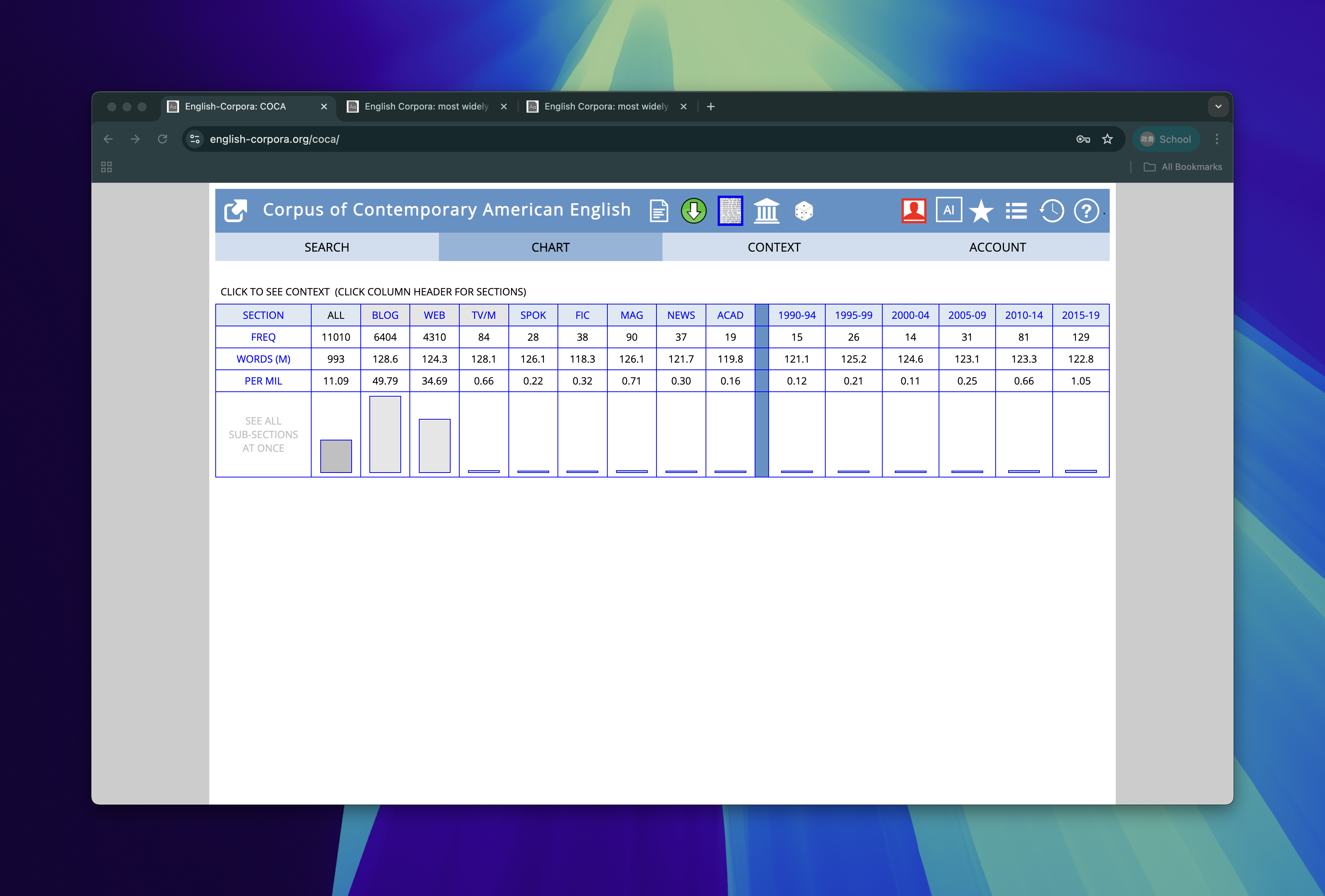 This allows you to return frequency by sections of of COCA (= conditional frequency).