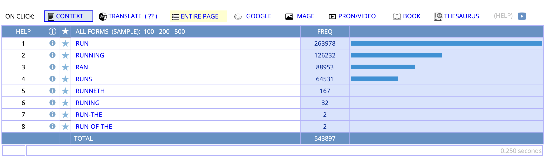 runs, ran, and running? Now we recognized that the word run was just one of the possible forms of the headword run.