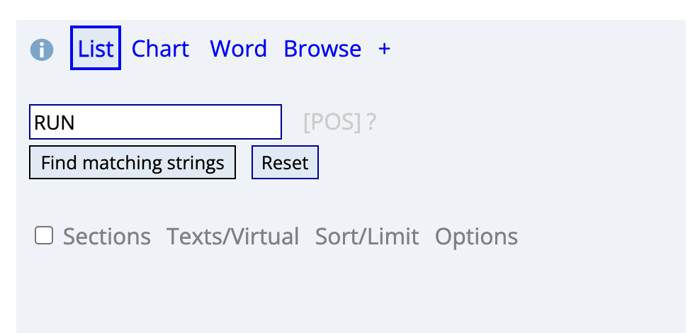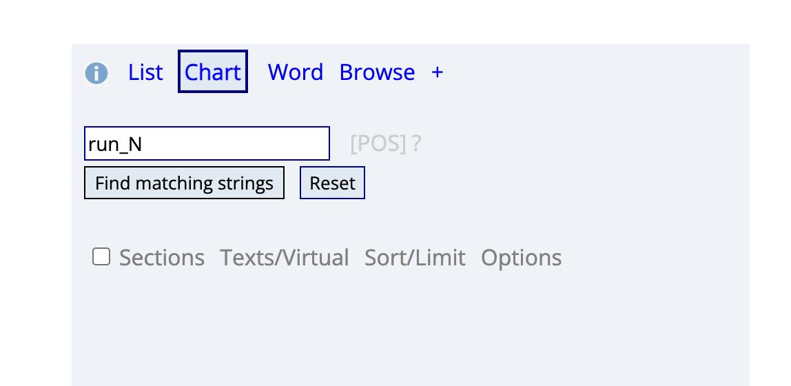 | POS Tag | Find words by grammatical category | run_N (noun)run_V (verb) |