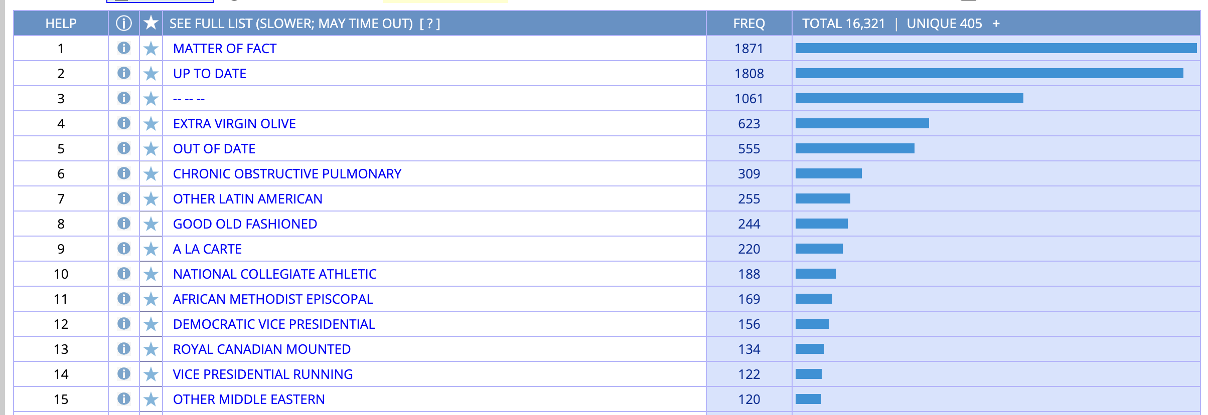Corpus search results: Provide some numbers or discourse samples based on your corpus search. This can be frequency list, table with frequency counts, or a copy of KWIC results.