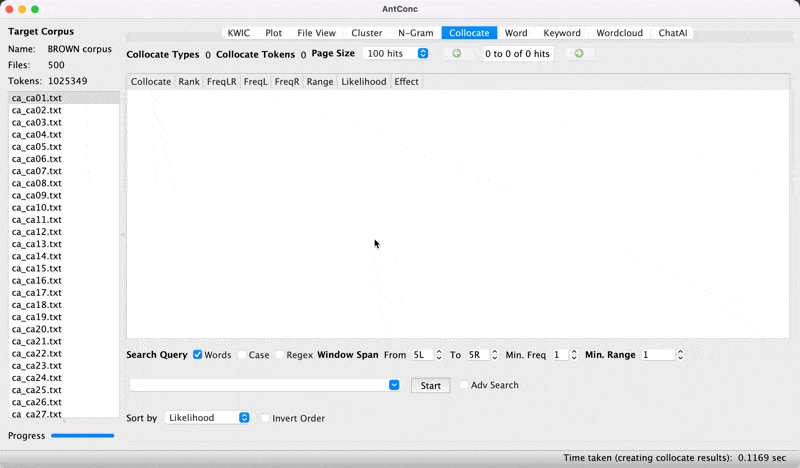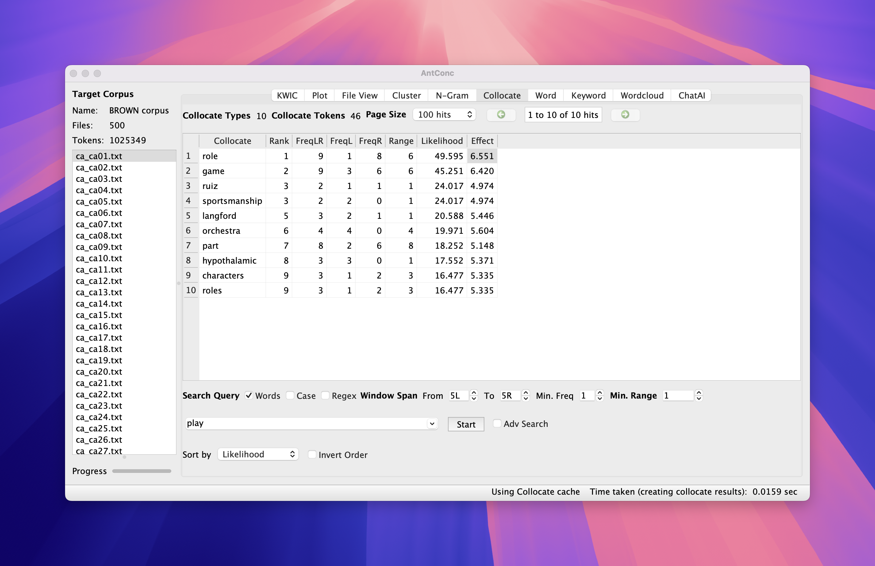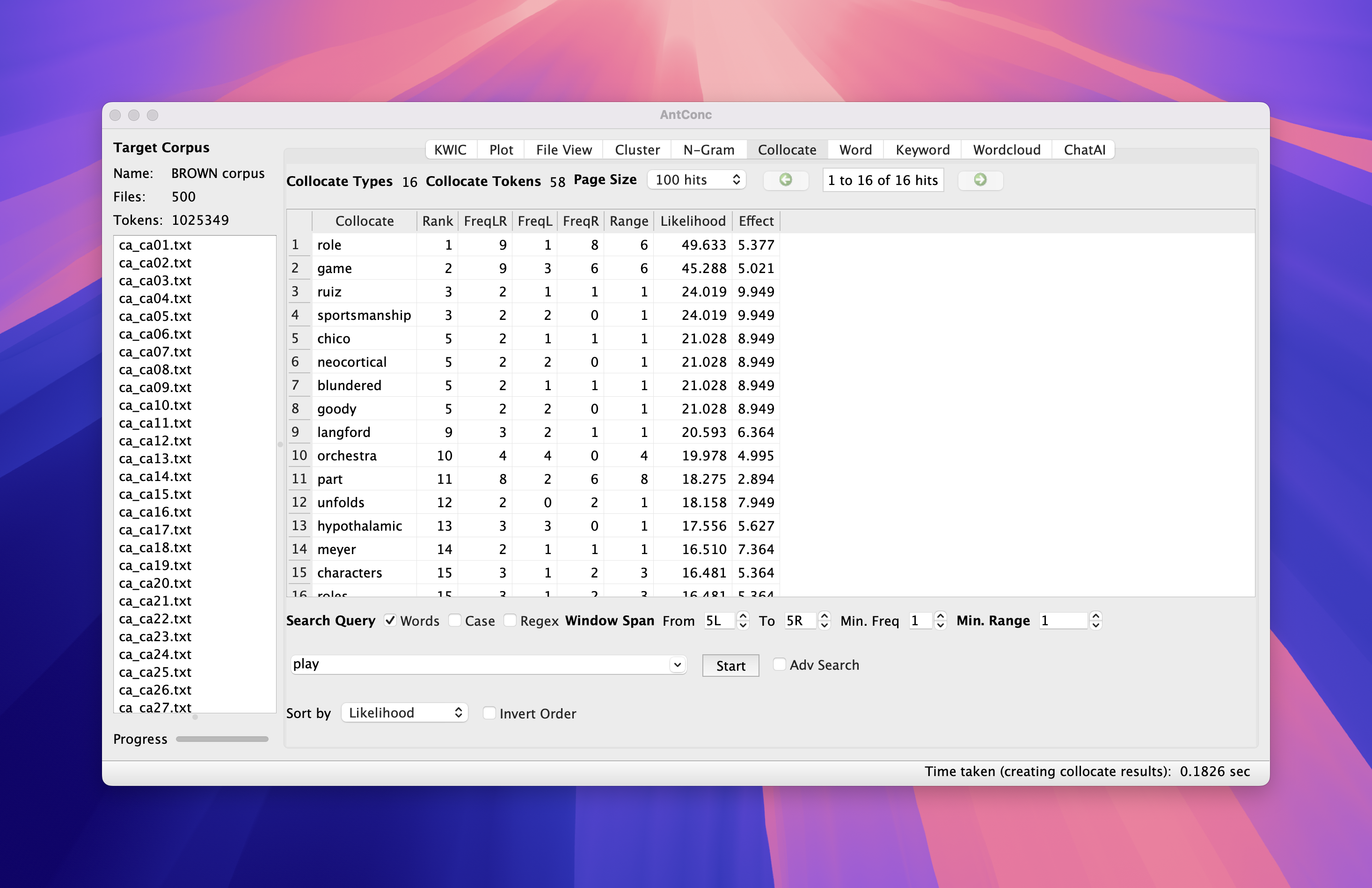 BROWN corpus.Collocateplay in search window and hit StartCollocation search in AntConc
