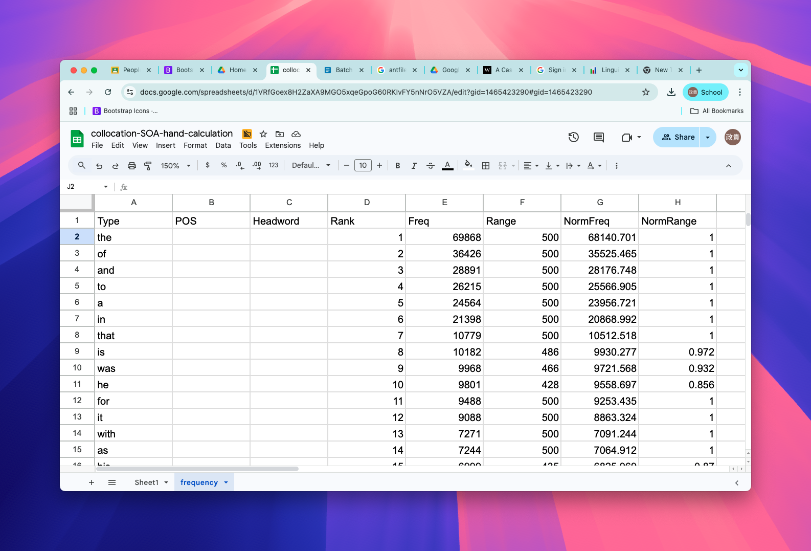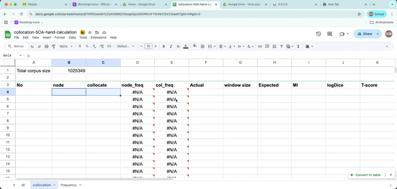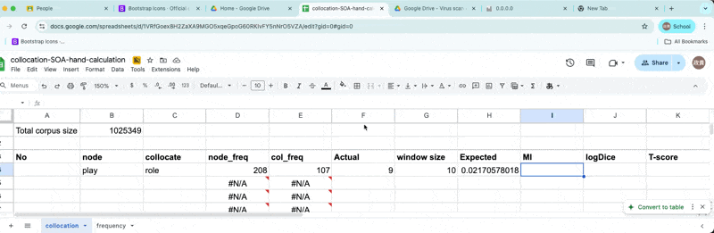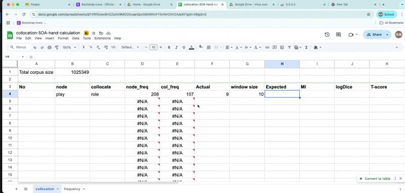 \[E_{11} = {(freq_{node} * freq_{collocate} ) \over Corpus size}\]